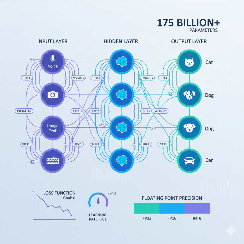 - Weights (Gewichten): Dit getal bepaalt hoe zwaar een specifiek signaal meeweegt. Als een model een afbeelding van een kat analyseert, krijgt de aanwezigheid van “puntige oren” een hoog gewicht.